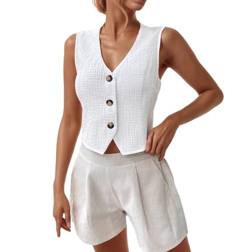 Womens Vest Top, Camisole Tops for Women Gilet Solid Color Short Sleeve Shirt Blouse With Hollow Out Collar And Decorative Buttons Casual For Summer (White XXL)