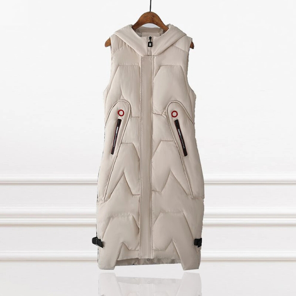 (white, XL) Womens Hooded Quilted Zip Up Gilet Waistcoat Padded Winter Vest Long Bodywarmer