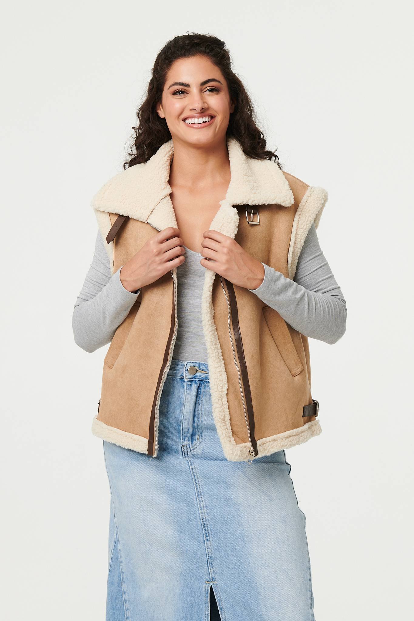 Izabel London Womens Ivory Faux Suede Fur Lined Sleeveless Gilet - White - Size Small/Medium