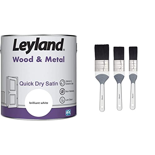 Leyland 423431 Wood & Metal Quick Dry Satin, 2.5 litres, white & Harris 102021010 Seriously Good Woodwork Gloss No-Loss Paint Brushes, 3 Brush Pack, 1", 1.5", 2"