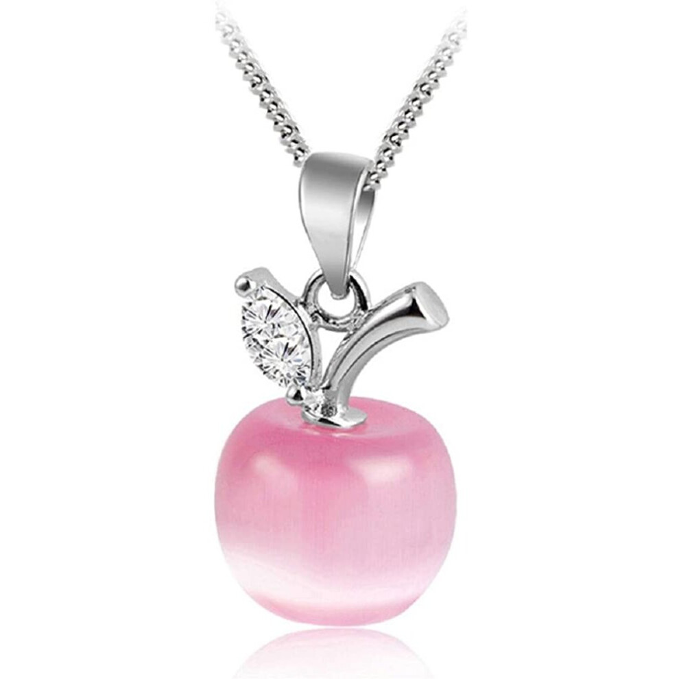 Apple Pendant Necklace with Austrian Crystals Simulated White Pink Rose Cat Eye Stone 18K White Gold Plated Jewelry Necklaces for Women 18"