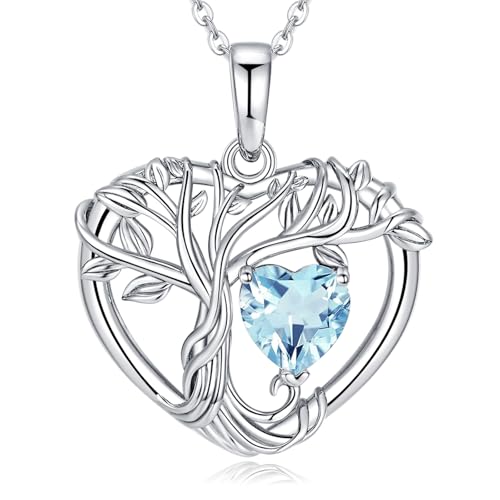 LOCIBLO Tree of Life Necklaces for Women 925 Sterling Silver Heart Pendant White Gold Light Blue Synthetic Aquamarine Necklace March Birthstone Jewellery for Her, 18"+2"