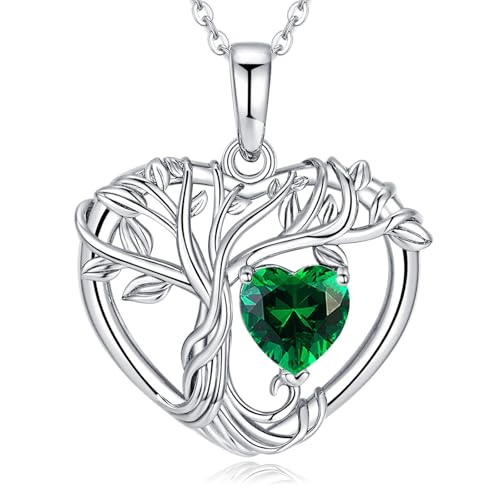 LOCIBLO Tree of Life Necklaces for Women 925 Sterling Silver Heart Pendant White Gold Green Synthetic Emerald Necklace May Birthstone Jewellery for Her, 18"+2"