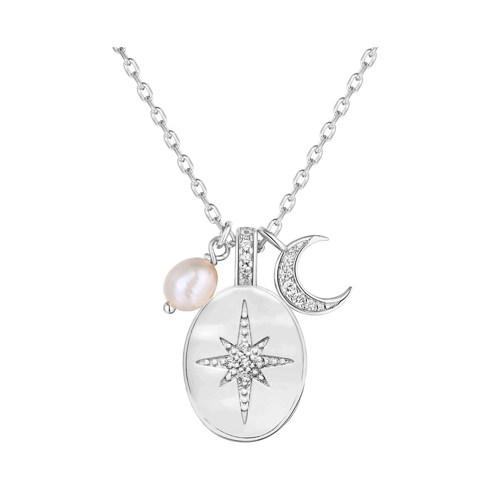 (White Gold, Pearl) HKEDES 14K Gold Plated Station Necklace - Simulated Diamond Layering Necklaces - Womens CZ Chain