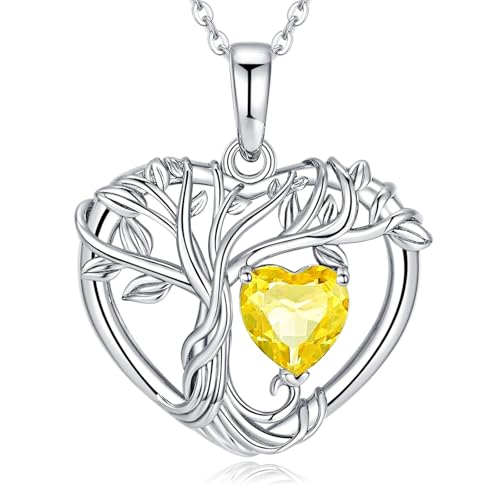LOCIBLO Tree of Life Necklaces for Women 925 Sterling Silver Heart Pendant White Gold Synthetic Citrine Yellow Topaz Necklace November Birthstone Jewellery for Her, 18"+2"