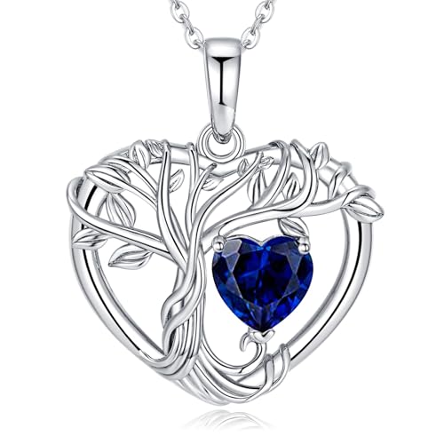 LOCIBLO Tree of Life Necklaces for Women 925 Sterling Silver Heart Pendant White Gold Blue Synthetic Sapphire Necklace September Birthstone Jewellery for Her, 18"+2"
