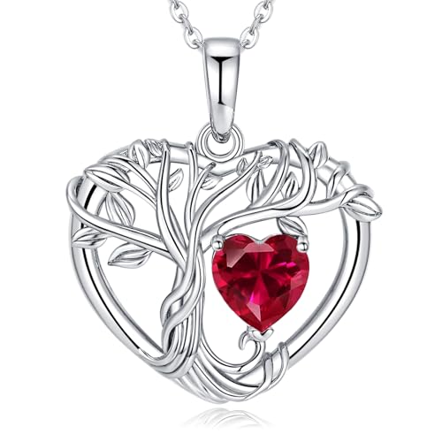 LOCIBLO Tree of Life Necklaces for Women 925 Sterling Silver Heart Pendant White Gold Red Synthetic Ruby Necklace July Birthstone Jewellery for Her, 18"+2"
