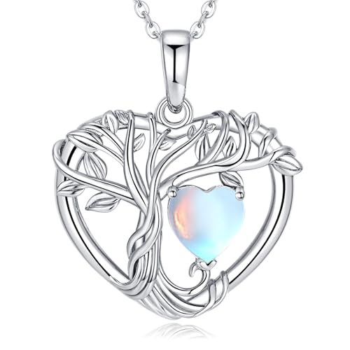 LOCIBLO Tree of Life Necklaces for Women 925 Sterling Silver Heart Pendant White Gold Synthetic Moonstone Necklace June Birthstone Jewellery for Her, 18"+2"