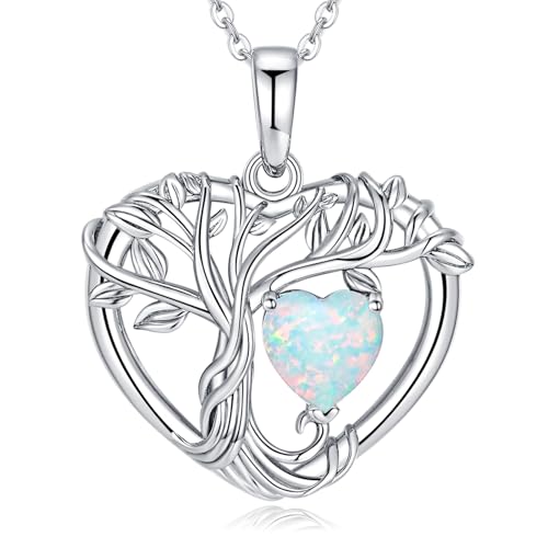 LOCIBLO Tree of Life Necklaces for Women 925 Sterling Silver Heart Pendant White Gold Synthetic Opal Necklace October Birthstone Jewellery for Her, 18"+2"