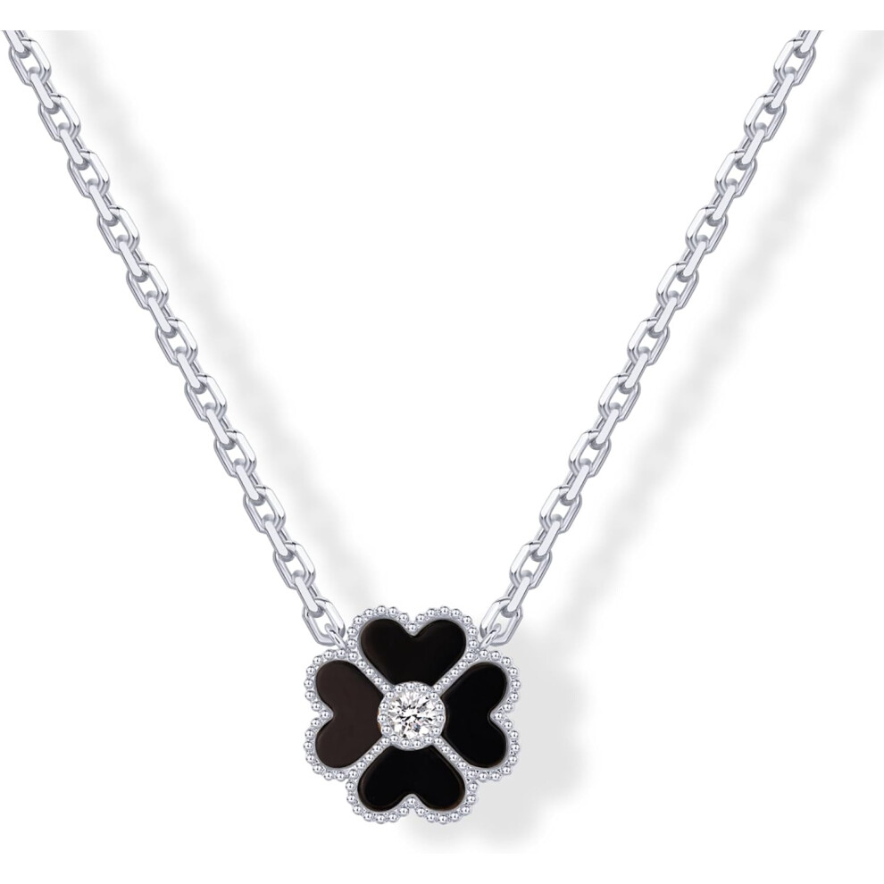 (White Gold, Black Onyx Flower) 14K Gold Plated Clover Necklaces for Women - Lucky Four Leaf Clover Necklace Pendant