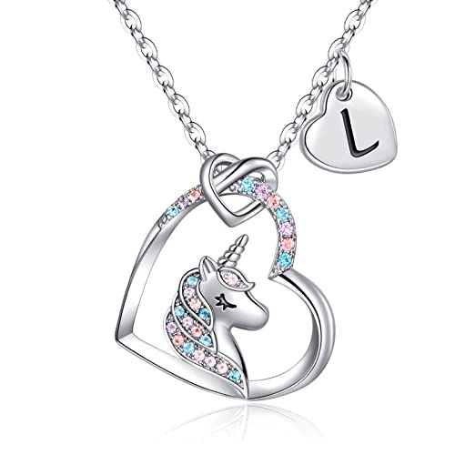 TINGN Unicorn Gifts for Girls, 14K White Gold Plated Unicorn Necklace for Girl Unicorn Necklace Dainty Heart Pendant Initial L Necklaces for Kids Gift Birthday Gifts for Girls Jewelry