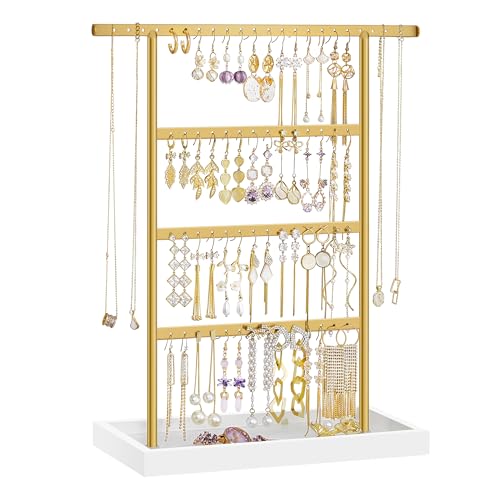 SONGMICS Jewellery Stand, 4-Tier Earring Holder Stand with Tray, Jewellery Organiser, Base Tray, for Studs Necklaces, Vintage, White and Gold Colour JJS019A01