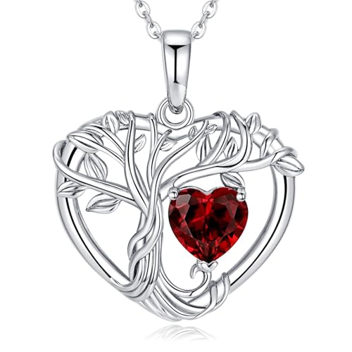 LOCIBLO Tree of Life Necklaces for Women 925 Sterling Silver Heart Pendant White Gold Red Synthetic Garnet Necklace January Birthstone Jewellery for Her, 18"+2"