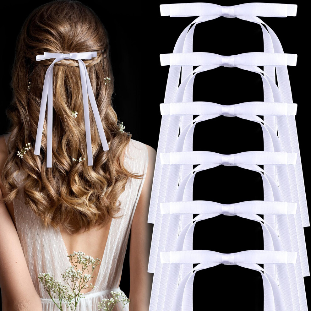 HINZIC 6PCS 4.4inch White Hair Bows Clips Long Ribbon Satin Bowknot Barrettes with Tassel Valentine Wedding Prom Decorative Hair Accessories for Teen