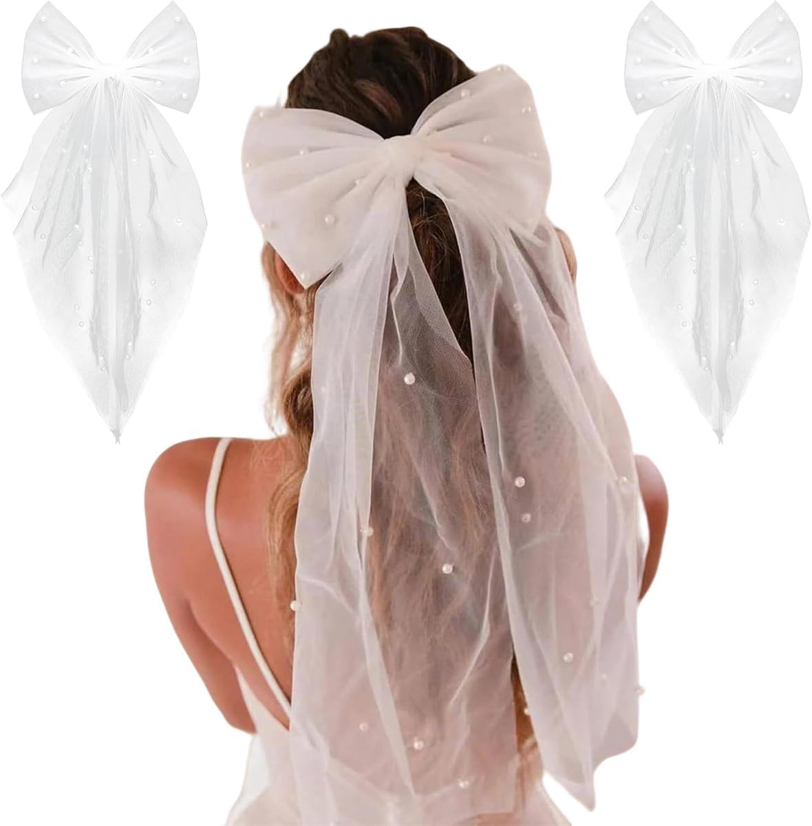 2pcs Bridal Hair Bow Veil Shower Hen with Pearl White Hair Clips, Wedding Acces