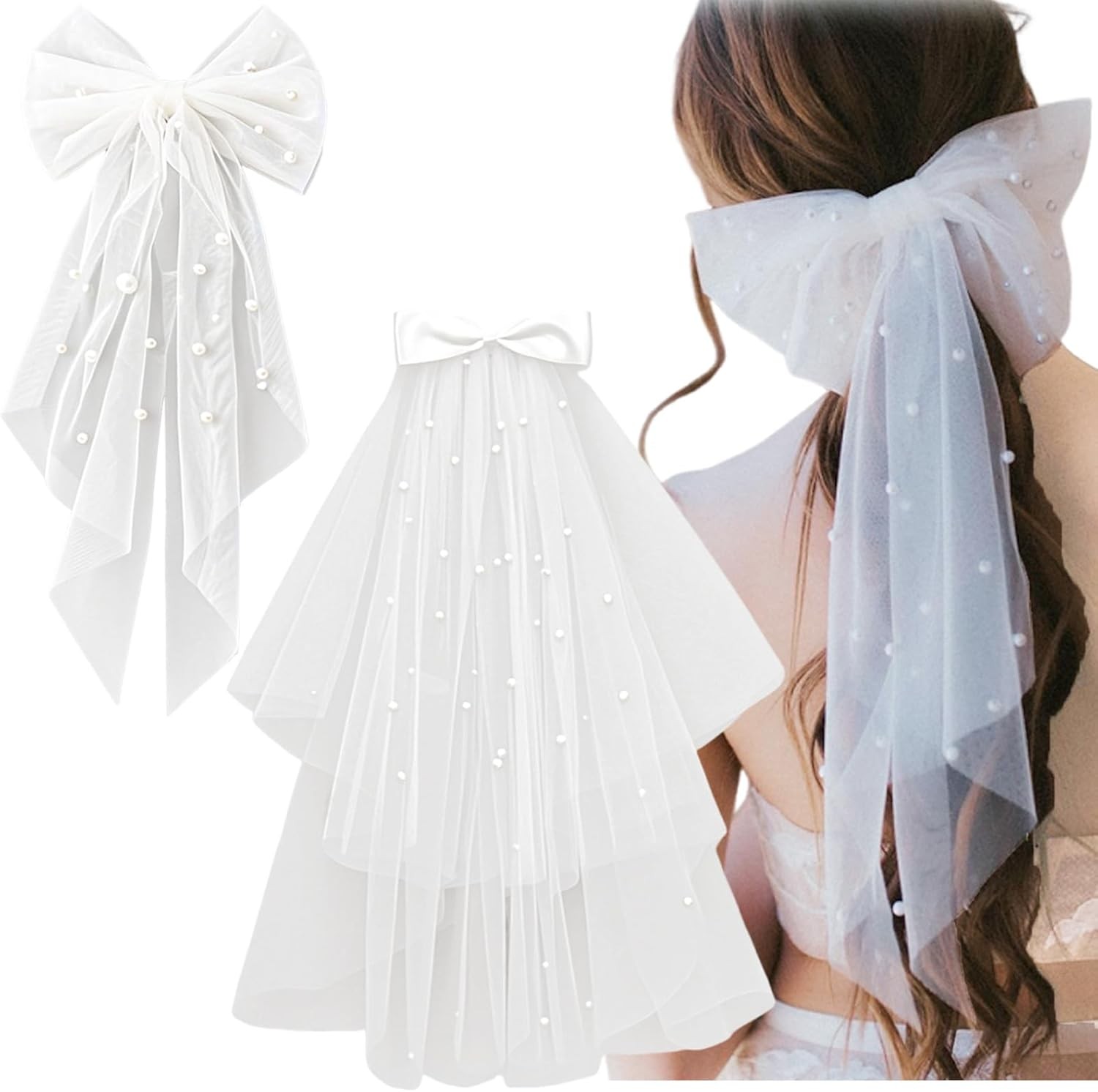 Bridal Hair Bow Veil with Pearl White Hair Clips Wedding Accessories for Bachelorette Party Bridal Shower Hen Night Bridesmaid Supplies