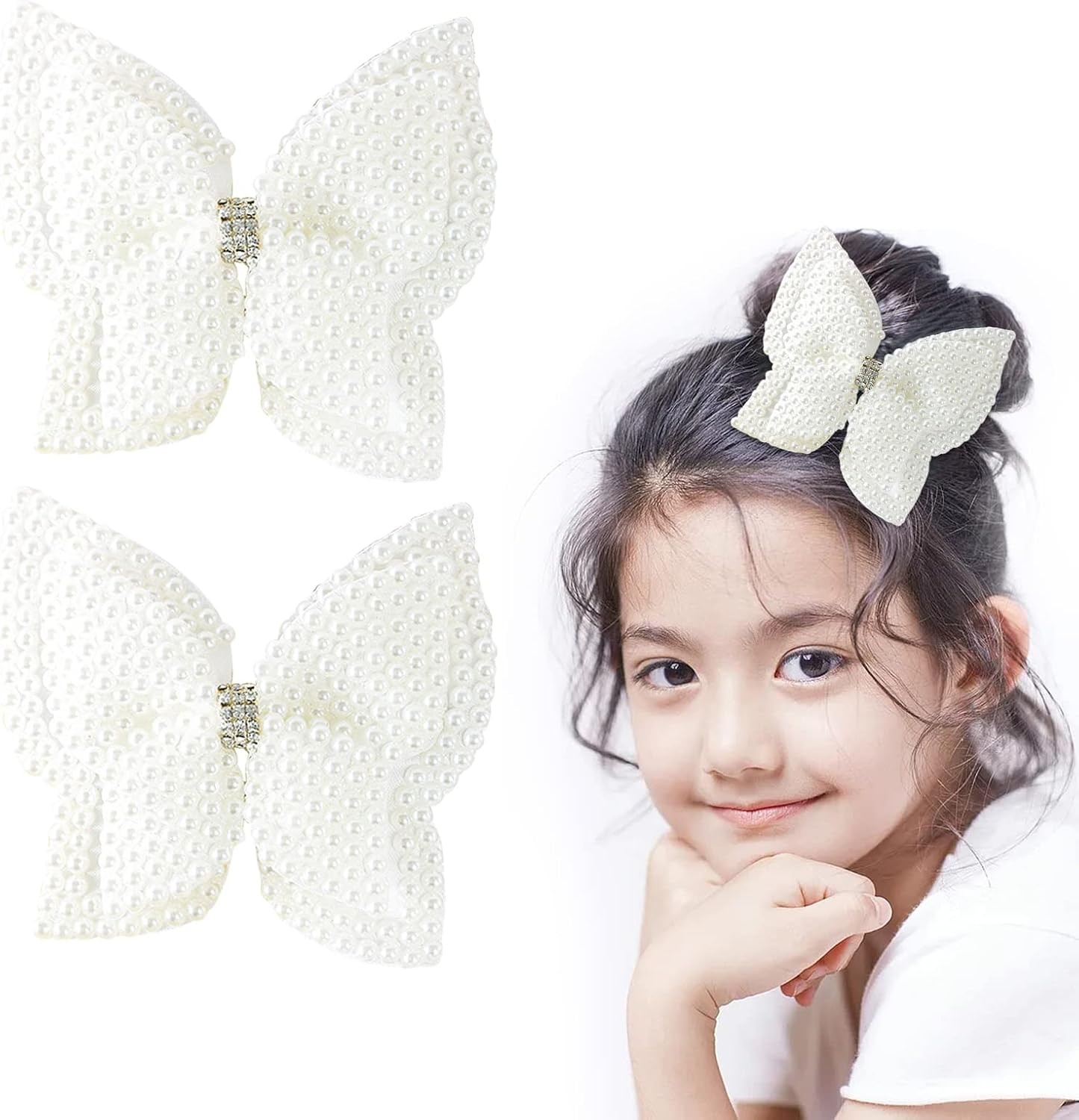 2Pcs White Hair Bow Clips, 3.5 Inches Pearl Hair Bows for Girls and Women, Whit