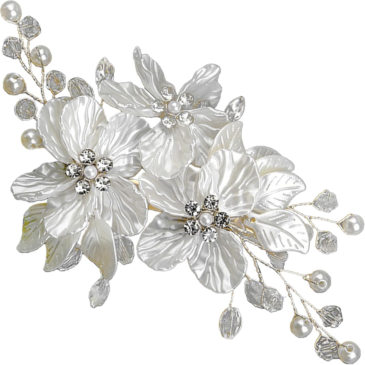 White Flower Hair Clips Silver Crystal Bridal Side Clips Floral Rhinestone Pearl