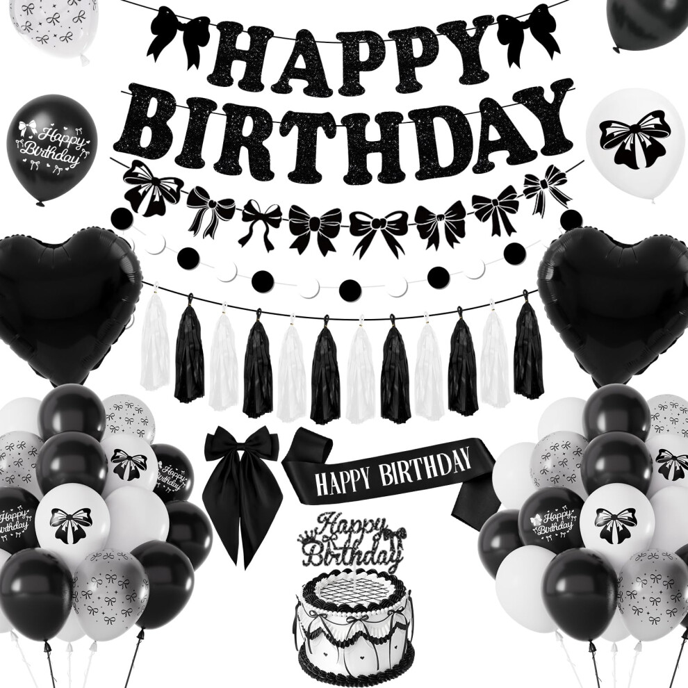 Bow Birthday Party Decoration, Black Bow Decorations with Happy Birthday Banner Glitter, Black White Balloons, Hair Clips, CakeTopper, Sash, Coquette