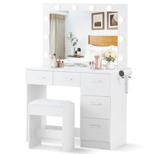LEMROE Bedroom Dressing Table with Mirror and Lights, White Vanity Desk with 5 Drawers and Power Sockets, Hair Dryer Holder, Adjustable Brightness Power Outlet (White)