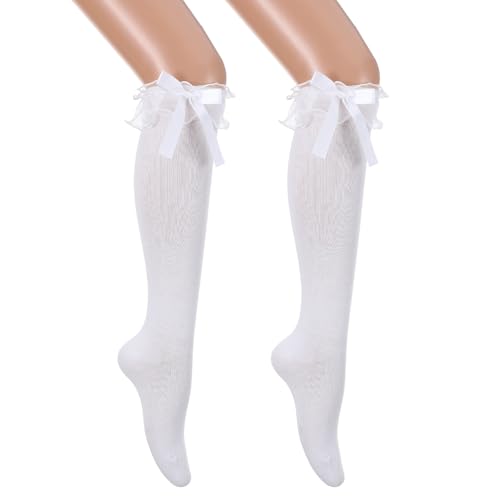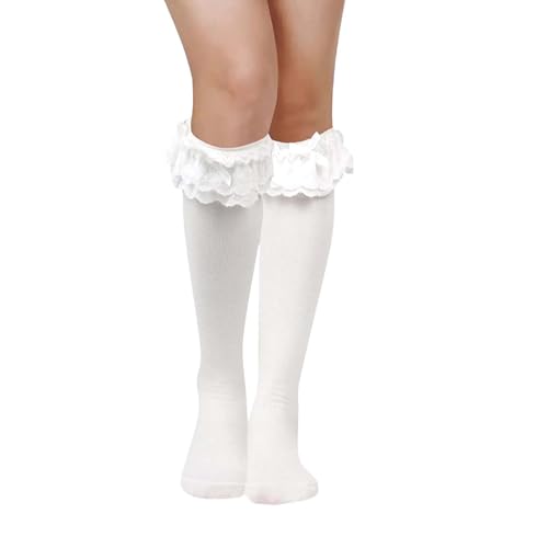 Xindojuz 1 Pair White Knee High Socks, Women's Girls Bow Lace Ruffled Thigh High Stockings, Lovely Cute Cotton Girls Princess Frilly Socks over the Knee Tube Dress Long Stockings