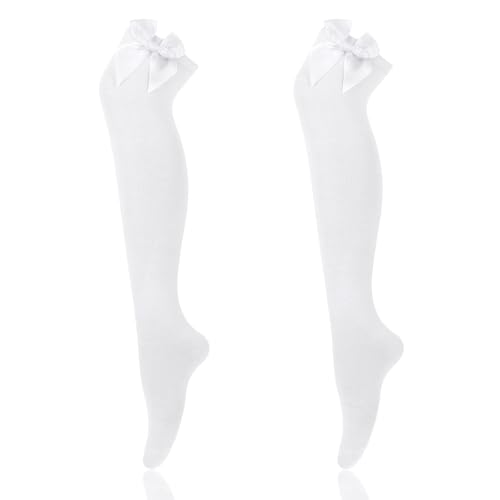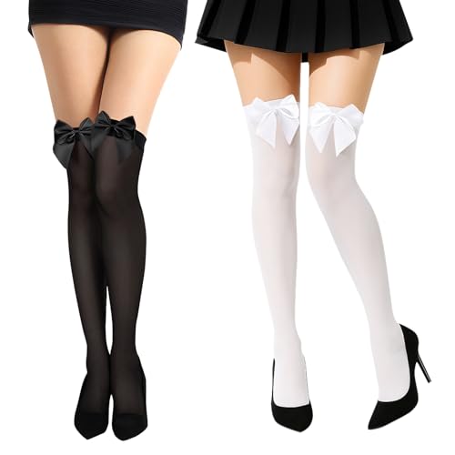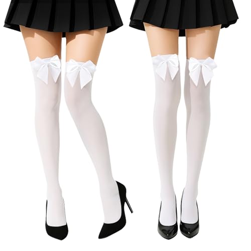 wlertcop 2 Pairs White knee high socks with Satin Bow, Opaque Bow Stockings Thigh High Stockings, for Oktoberfest, Halloween Girls, Women Valentine's Day Favors