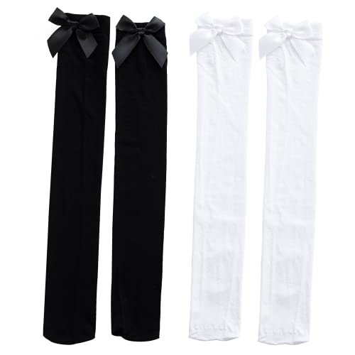 2 Pairs Knee High Socks Thigh High Stockings,Black and White Knee High Bow Socks Women's Knee-High Socks Frilly Ribbons Bow Long Socks for Women Over The Knee