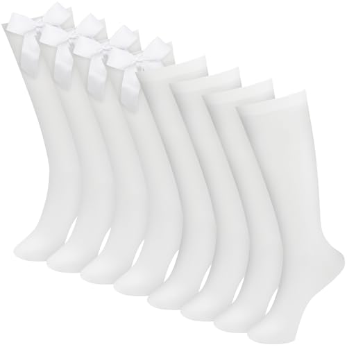 ZOCONE 4 Pairs White Knee High Socks for Girls - Back to School Uniform With Bow, Long Cotton Mid Calf Socks for 8-12 Years, UK 12-3