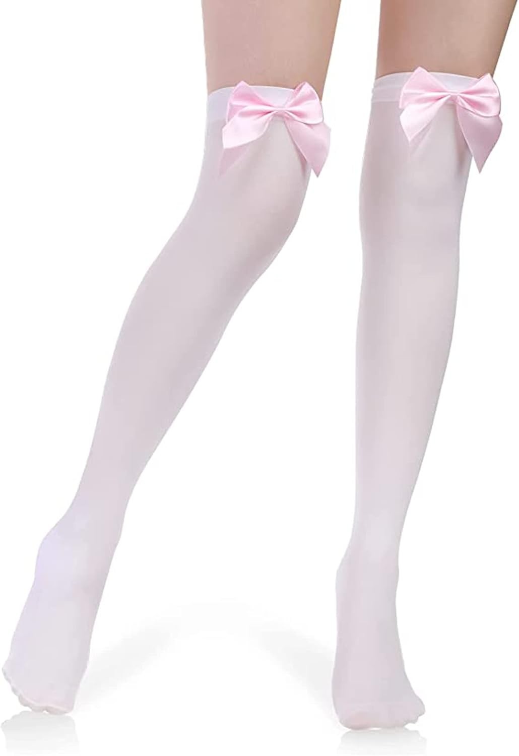 IRYNA 1Pair White Knee High Socks with Pink Satin Bow, Long Socks for Women Over The Knee, Opaque Bow Lace Thigh High School Stocking for Women Valentine's Day Favors