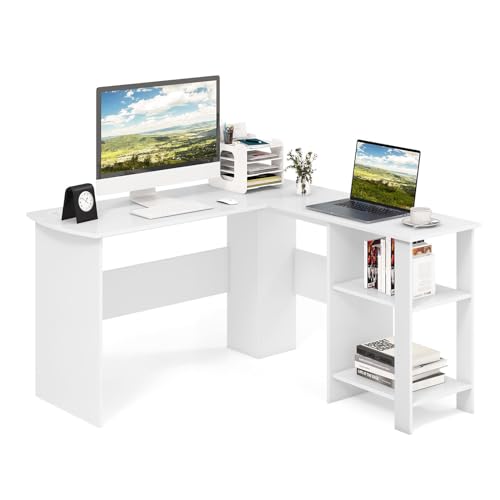 CASART L-shaped Computer Desk, Wooden Writing Desk with Storage Shelves & Cable Holes, Home Office Computer Workstation PC Laptop Table for Bedroom Study (White)