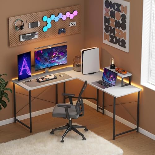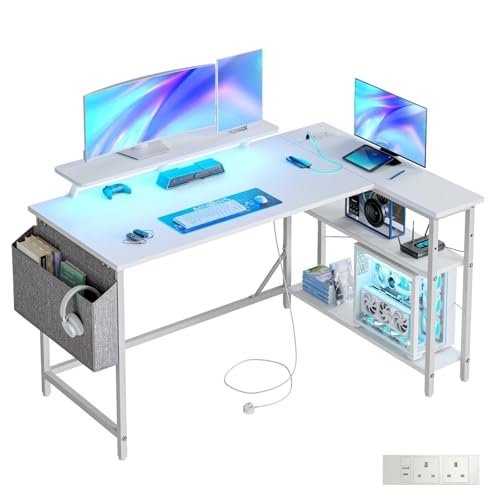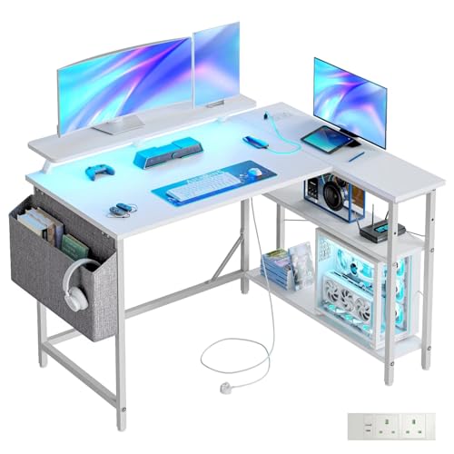 Aheaplus L Shaped Gaming Desk with Power Outlets & LED Lights, Small L- Shaped Desk Computer Corner Desk with Monitor Stand & Storage Shelf, Home Office Desk Writing Desk with Storage Bag, White