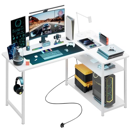 BEXEVUE 120cm White L Shaped Gaming Desk with Power Outlets, Reversible Corner Desk with Shelves & Monitor Stand, Computer Table with Storage Bag for Home Office, White