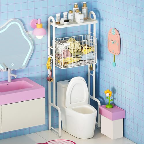 Over the Toilet Shelf White with Laundry Basket Top Storage Raised Guardrail Bathroom Storage Organizer, Thickened Carbon Steel Easy to Access Stable and Load-bearing(60 * 29.5 * 166cm)