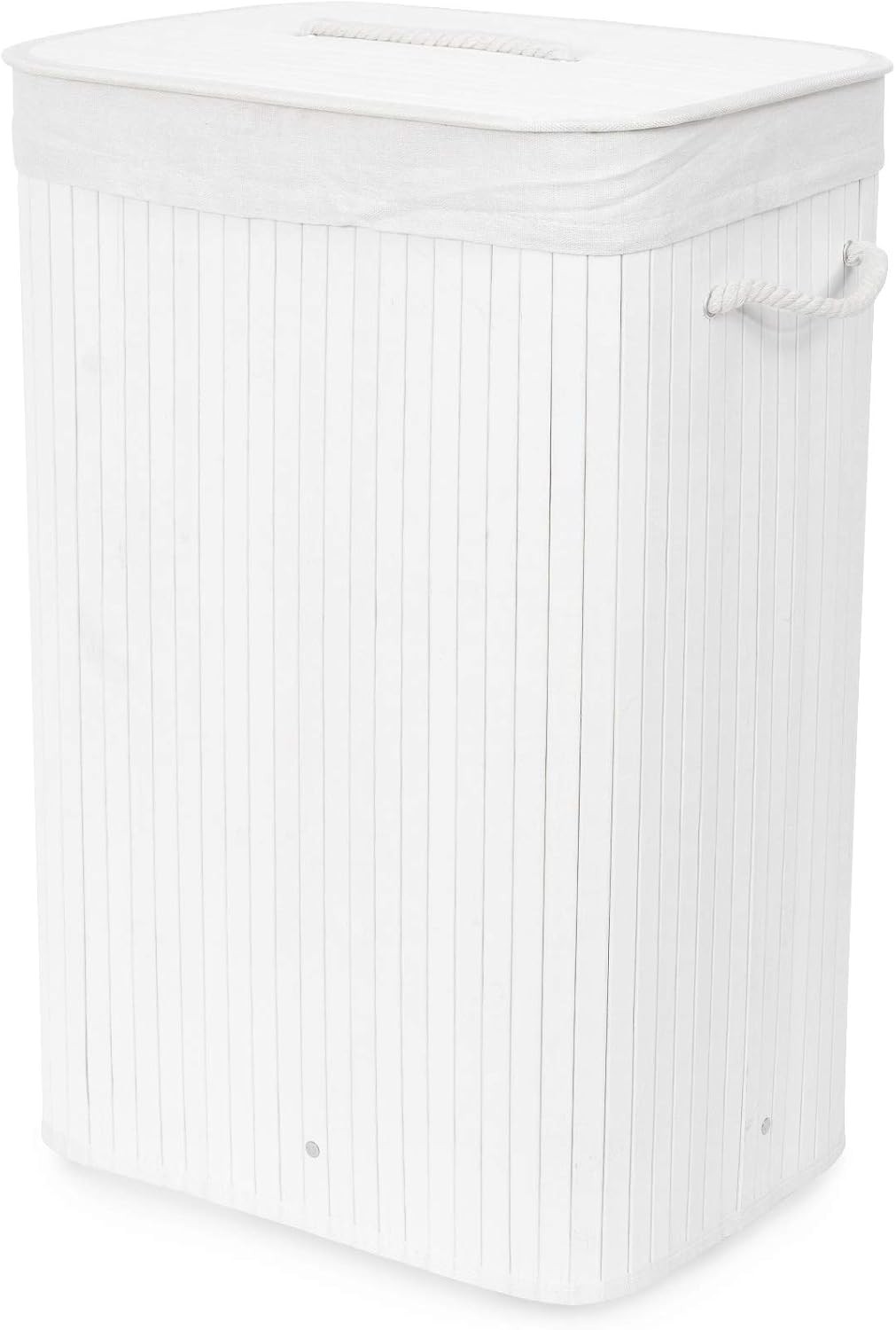 Compactor Bamboo White Laundry Basket with Lid, Foldable Washing Hamper for Storing Clothes and Linen in Bedrooms and Bathrooms, Removable Liner and Rope Handles