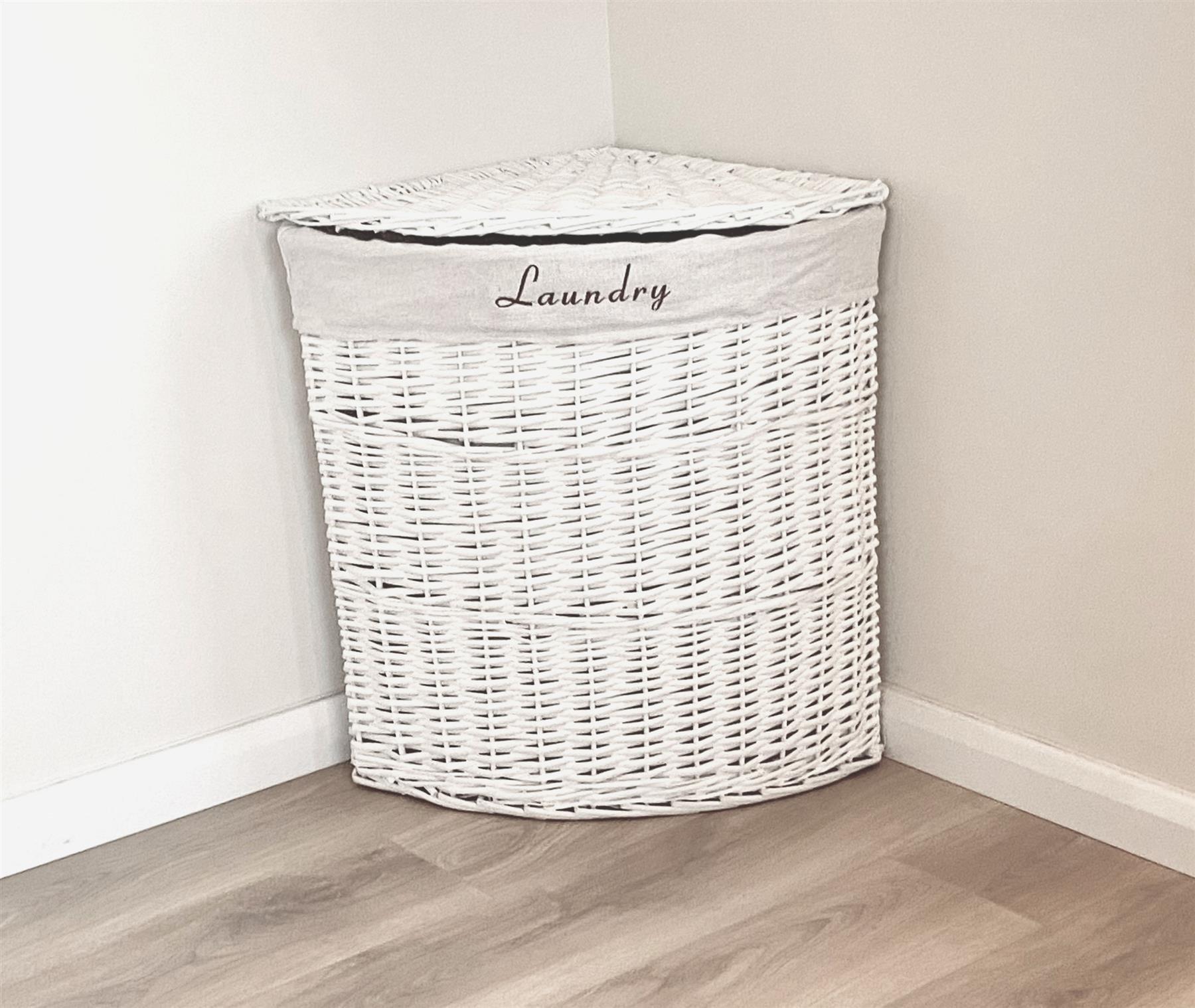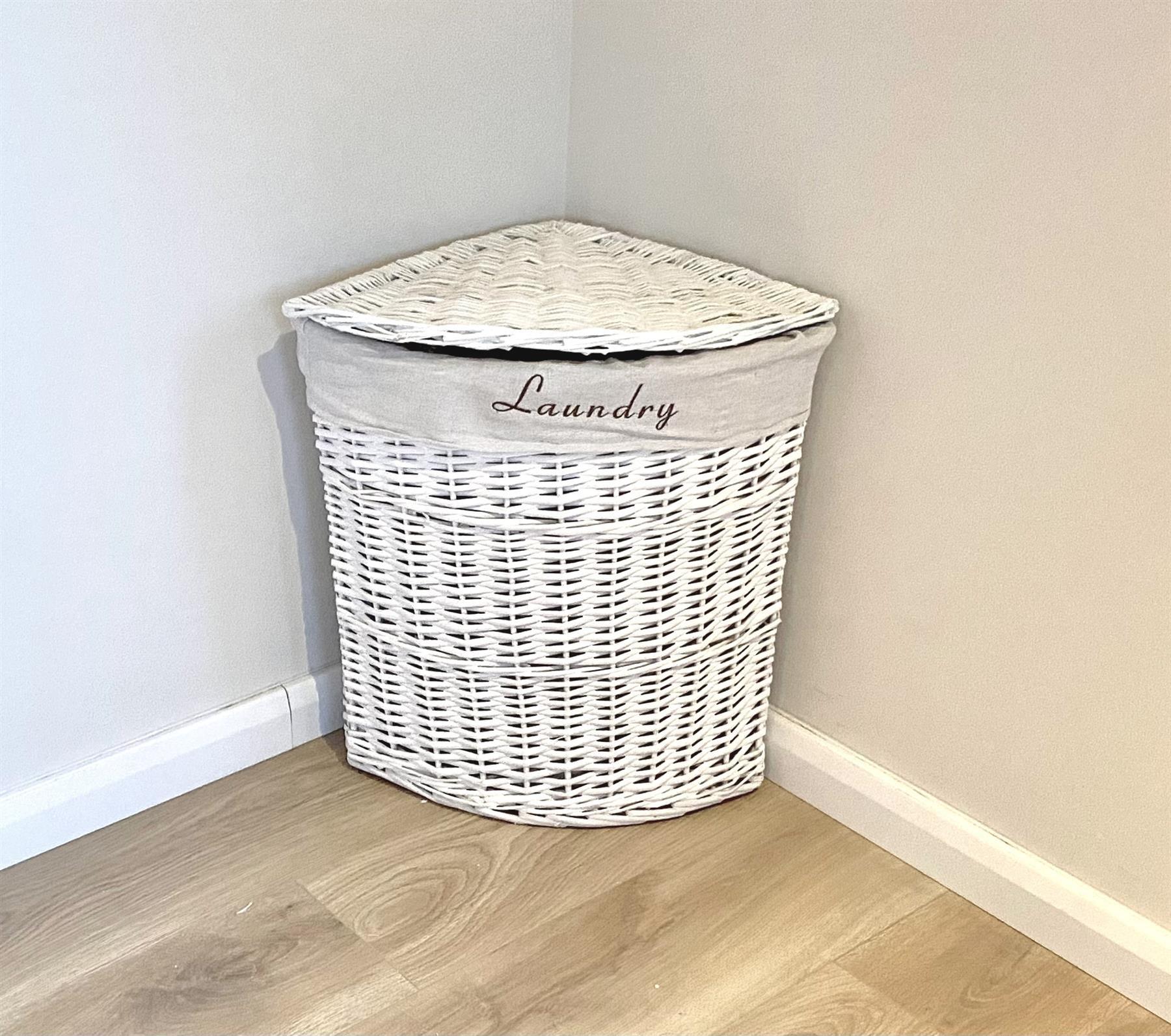 White Corner Wicker Laundry Basket with Cotton Lining Large 62 x 46 x 60 cm