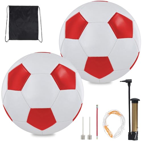 Nexhyp 2 Pack Kids Football Size 5 Premium Leather - Durable Soccer Ball and Pump for Boys Girls Adults, All-Weather Indoor Outdoor Football Training & Competition Use (Red White)