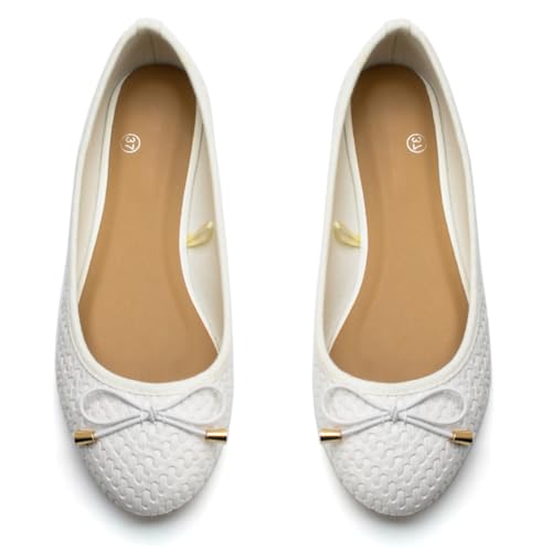 Dernolsea Womens Ballet Flats, Patent Leather Bow Round Toe Foldable Flat Slip On Pumps Dolly Ballerina Shoes Pure White Size 4.5-5