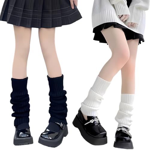 BENIFILE 2 Pairs White Black Leg Warmers 80s Y2k Ribbed Knit Legwarmers for Women Girls Ladies Leg Warmer UK Womens Fashion Ankle Warmers for Ballet Yoga Dance Ice Skating (40CM)