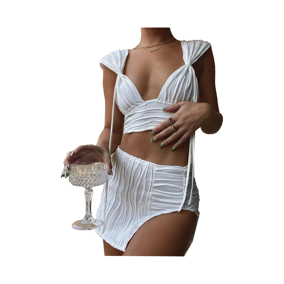 (M) White Pleated Mini Skirt Crop Top Set Women Outfits & Sets