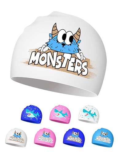 Kids Swimming Cap for 4-12 Years - Waterproof, Silicone, Adorable Design, Non-Slip (White monster)