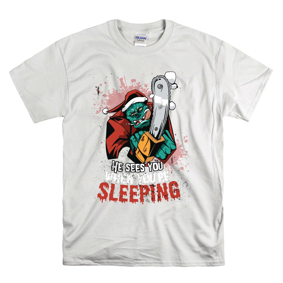 (XX-Large, White) Monster Santa He Sees You When You're Sleeping Men Women Unisex Top T Shirt