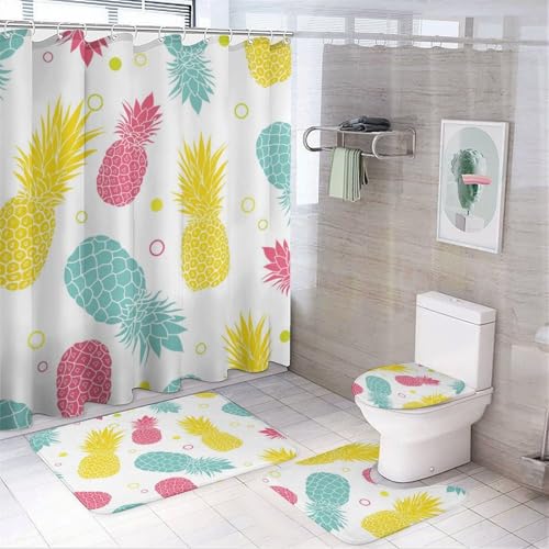 4 Pcs Shower Curtain with Matching Doormat Sets, Bath Curtain with Rugs(U Shape Mat, Bath Mat, Toilet Lid Cover Mat) with Hooks Print Seamless Colorful Pineapples on White Summer Tropical Fruits