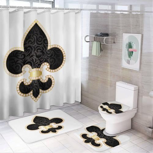 4 Pcs Shower Curtain with Matching Doormat Sets, Bath Curtain with Rugs(U Shape Mat, Bath Mat, Toilet Lid Cover Mat) with Hooks Print Luxury Black Floral Fleur De Lis with Gold Diamond Rim on White
