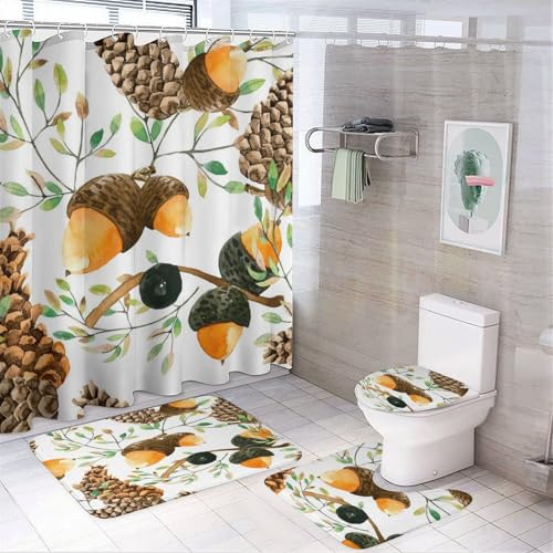 4 Pcs Shower Curtain with Matching Doormat Sets, Bath Curtain with Rugs(U Shape Mat, Bath Mat, Toilet Lid Cover Mat) with Hooks Print Acorns and Cones with Leaves On White