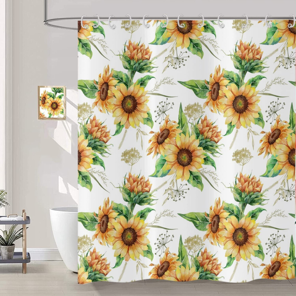 Sunflower Shower Curtain, Yellow & White Blossoms on Green Leaves, Farmhouse Bathroom Decor, Waterproof, Machine Washable, with Hooks (72"x84")
