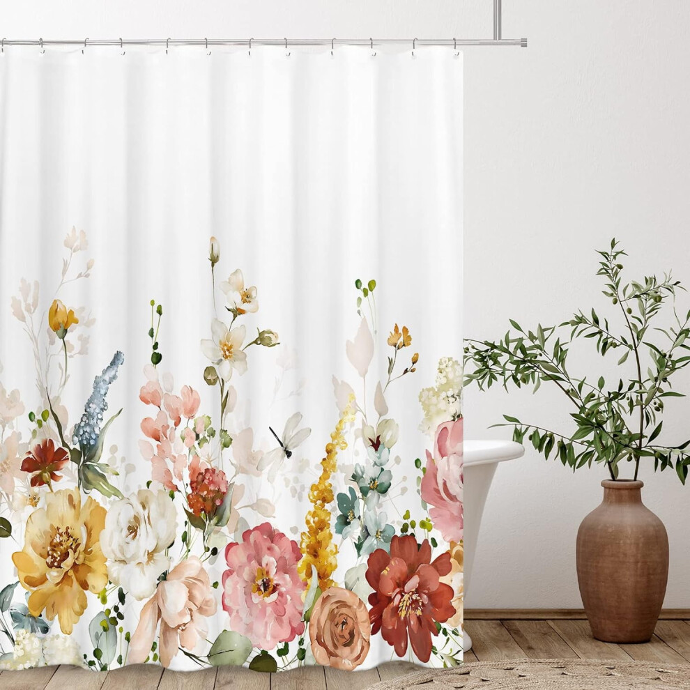 Aesthetic Blooming Floral Shower Curtain, Watercolor Red Flowers on White, Sage Green Leaves, Tropical Decor, 71x71", Polyester Waterproof, with