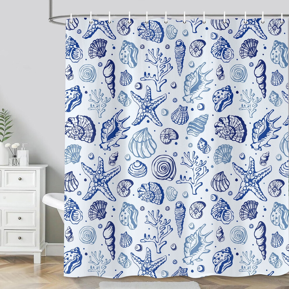 Beach Coastal Shower Curtain, Navy Blue Seashell Print on White Background, Washable 70x70 Inches