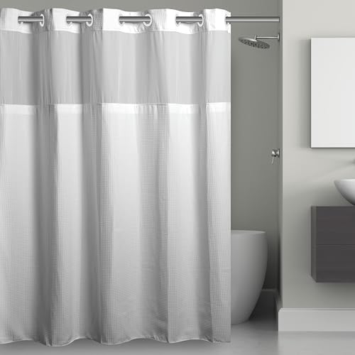 Hookless It’s A Snap! Waffle Shower Curtain, 3-in-1 Shower Curtain Includes Fabric Shower Curtain with Sheer Top Window, Flex-On Rings & Fabric Liner, 54” x 80”, White