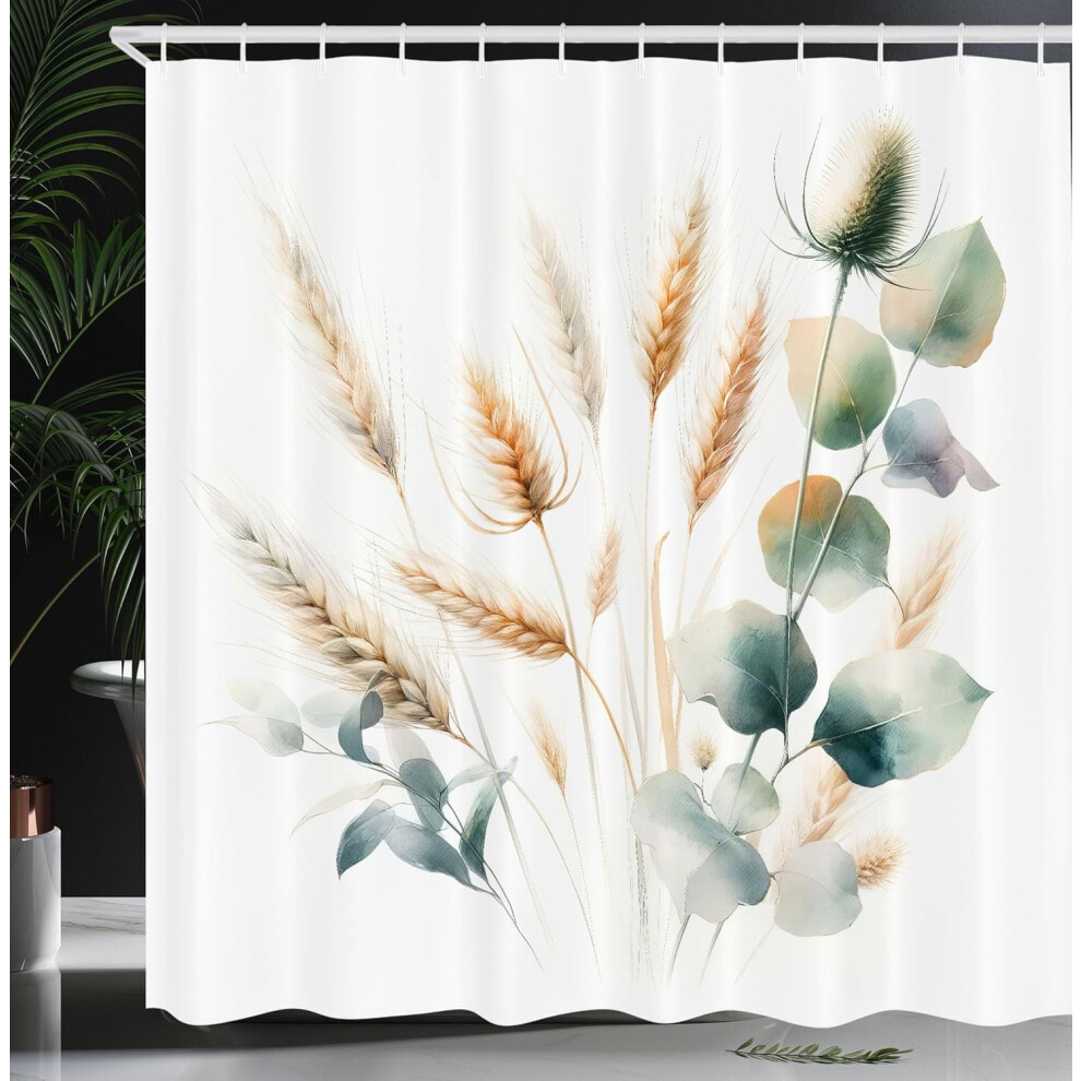 Boho Shower Curtain, Aquarelle Wheat & Eucalyptus Art on Plain Back, Cloth Fabric with Hooks, 72"x72", White Laurel Green Almond