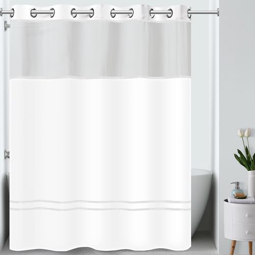 Waterproof Linen Style Fabric Shower Curtain, Snap-On Liner for Easy Cleaning, Hotel Quality Mesh Top Window for Light Filtering, Elegant White, 70.8"